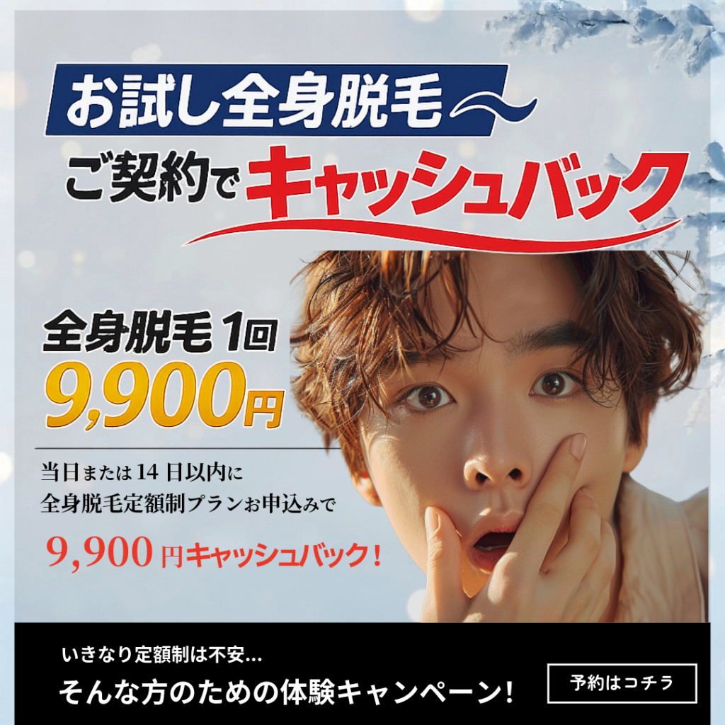 全身脱毛を始めたいけど、 「いきなり定額制は不安…」 そんな方のための体験キャンペーンです。 まずは 全身脱毛を9,900円でお試し。 施術内容・痛み・通うペースなどを実際に体験してからご検討いただけます。 さらに、 当日または14日以内に定額制全身脱毛プランへお申込みいただくと、 お試し料金9,900円をキャッシュバック。 無理な勧誘は一切ありません。 納得してから始めたい方におすすめのキャンペーンです。 |