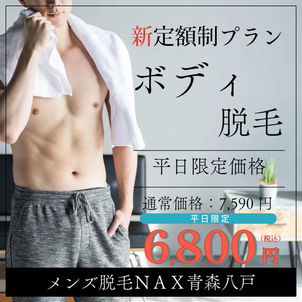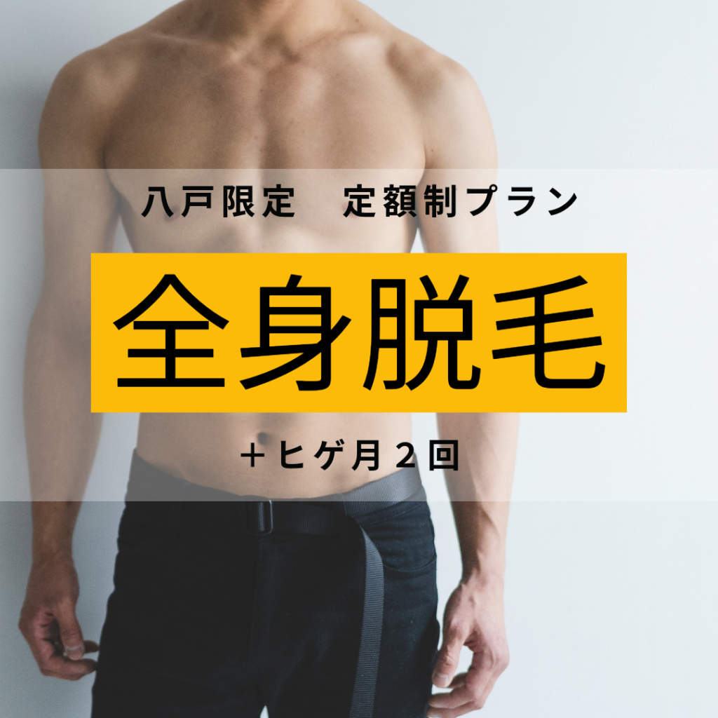 全身をしっかりケアできる大満足プランです。時間をたっぷり使って、気になる箇所を徹底的に脱毛! 自己処理が面倒な方や、全身を一度にケアしたい方におすすめです。※剃り残しがある場合、シェービングの時間が施術時間に含まれます。【メンズ脱毛/八戸/城下/十和田/三沢/二戸】 |
